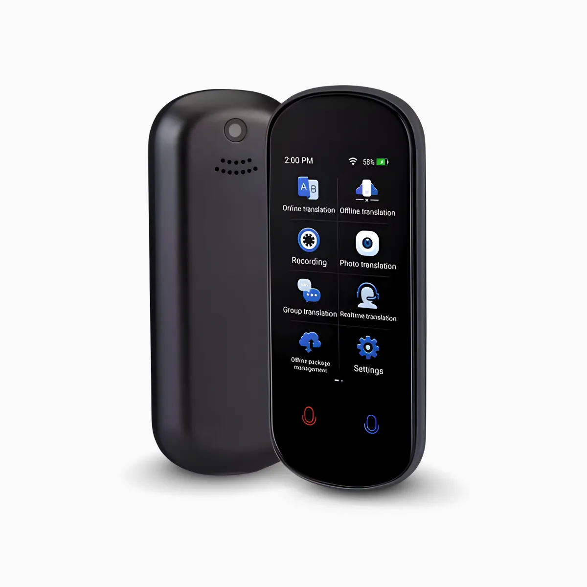 Ideal para situações de viagem e negócios. - Conectividade Bluetooth: Suporta conexão com fones de ouvido ou alto-falantes Bluetooth, permitindo um uso mais versátil e sem fio. - Microfone Duplo com Cancelamento de Ruído: Equipado com microfones duplos e tecnologia de redução de ruído, o dispositivo capta áudio com clareza, mesmo em ambientes ruidosos, com um alcance de até 2 metros. - Tela Sensível ao Toque 3D: A tela IPS de alta definição oferece uma navegação fácil e intuitiva, com um design ergonômico que proporciona conforto ao toque. - Bateria de Longa Duração: Com uma bateria de 1500mAh, o dispositivo suporta até 8 horas de uso contínuo e até uma semana em stand-by. - Design Compacto e Portátil: Com dimensões pequenas o tradutor é leve e fácil de transportar, ideal para levar no bolso ou na mochila.